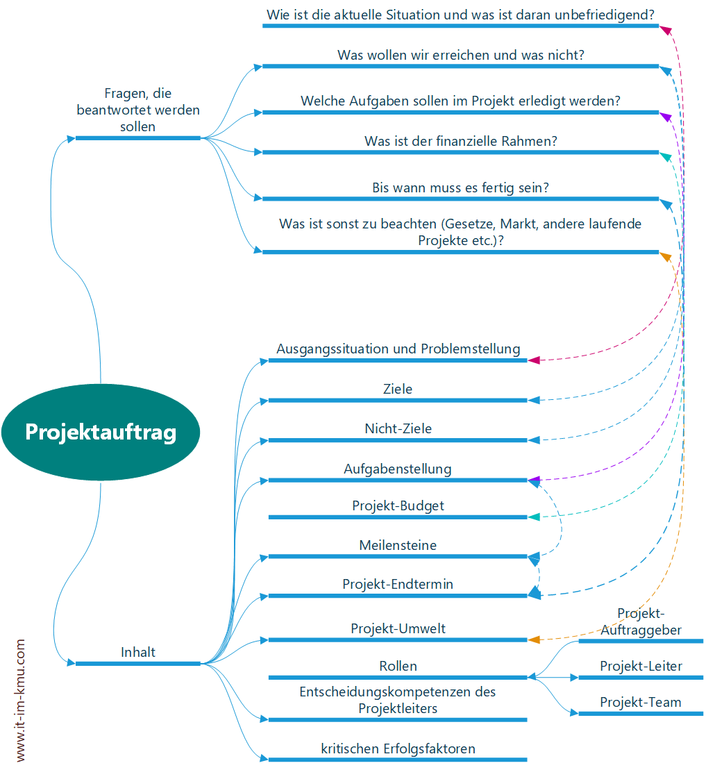 Mit dem Projektauftrag sollen eine Reihe von Fragen zum Projekt beantworten werden. Daraus ergibt sich dann auch der empfohlene Inhalt für einen Projektauftrag.